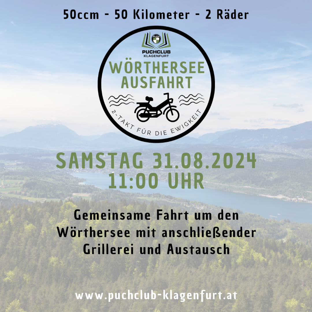 Am 12. August 2023 veranstaltete der Puchclub Klagenfurt die Wörtherseeausfahrt 2023. Als Unterschied zum Vorjahr waren auch weitere Puch-Freunde aus Kärnten, Steiermark, Salzburg und Oberösterreich bei der Ausfahrt dabei. Die in Summe 44 Teilnehmenden fuhren mit Stopps rund um den See – insgesamt 50 Kilometer. Unser Pannenfahrzeug musste bei insgesamt 5 Mopeds helfen. Mit dem mitgeführten Werkzeug konnten alle, bis auf 2 Mopeds, die gesamte Strecke absolvieren. Ziel war die anschließende Grillerei im Kolpinghaus, wo wir den Abend unter den Eichen ausklingen liesen.