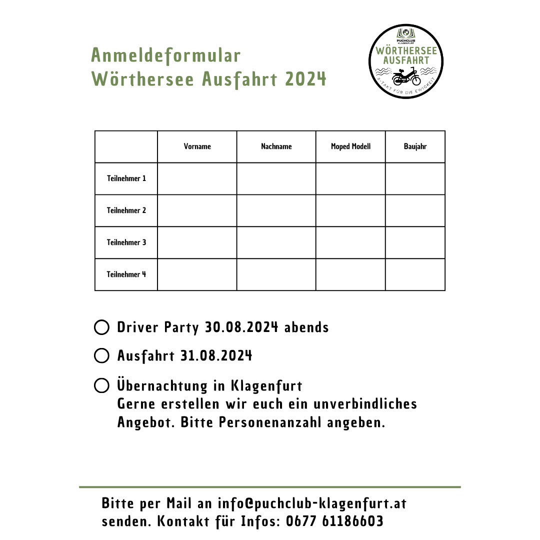 Auch dieses Jahr laden wir euch wieder herzlich zu unserer gemeinsamen Ausfahrt rund um den Wörthersee ein! Nähere Infos sind den unteren Bildern zu entnehmen. Bei Fragen meldet euch gern per E-Mail oder Telefon.