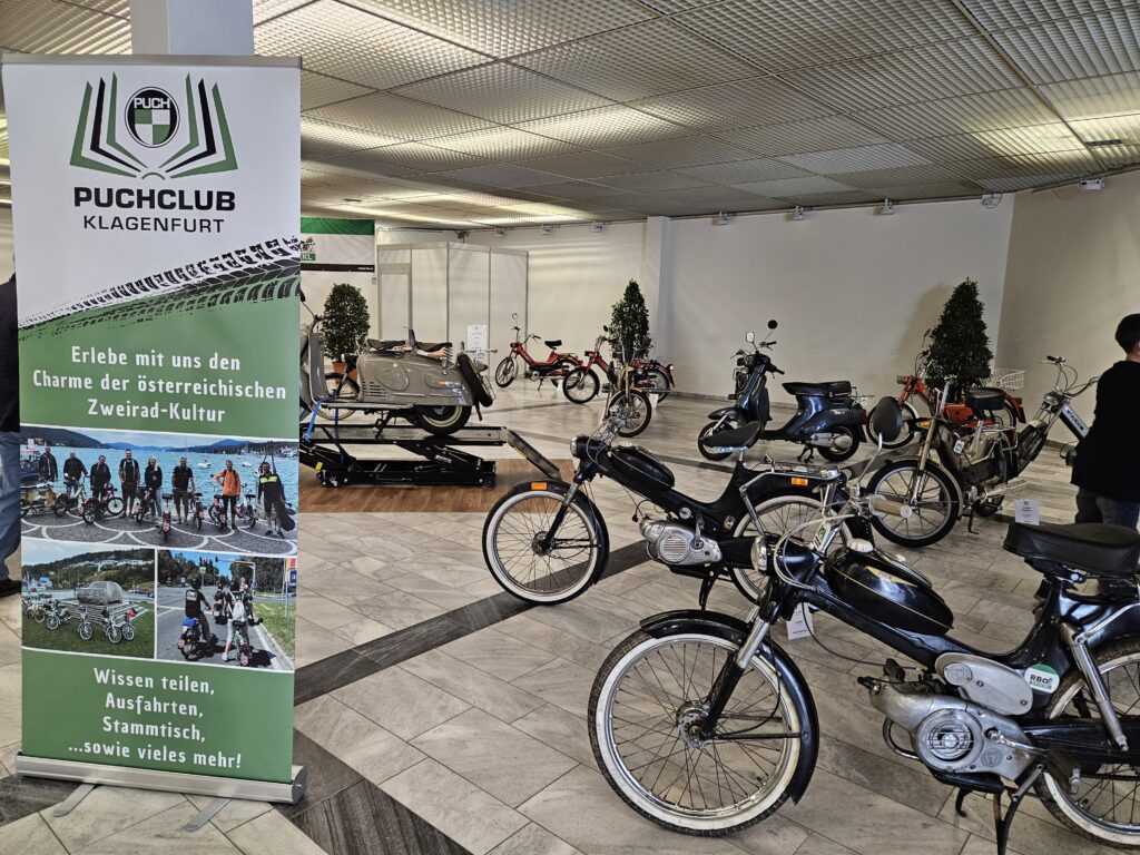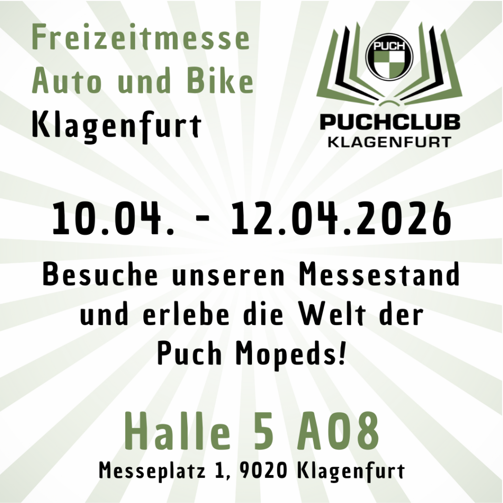 Auch vom 05.04. – 07.04.2024 war der Puchclub Klagenfurt auf der Freizeitmesse in Klagenfurt vertreten. An unserem Stand konnte man die Vielzahl unserer PUCHs bewundern und sich bei einem Getränk austauschen. Etliche Besucher erinnerte der Anblick der alten Mopeds an ihre Jugend und erzählten uns die lustigsten Geschichten. Bis zum nächsten Jahr!